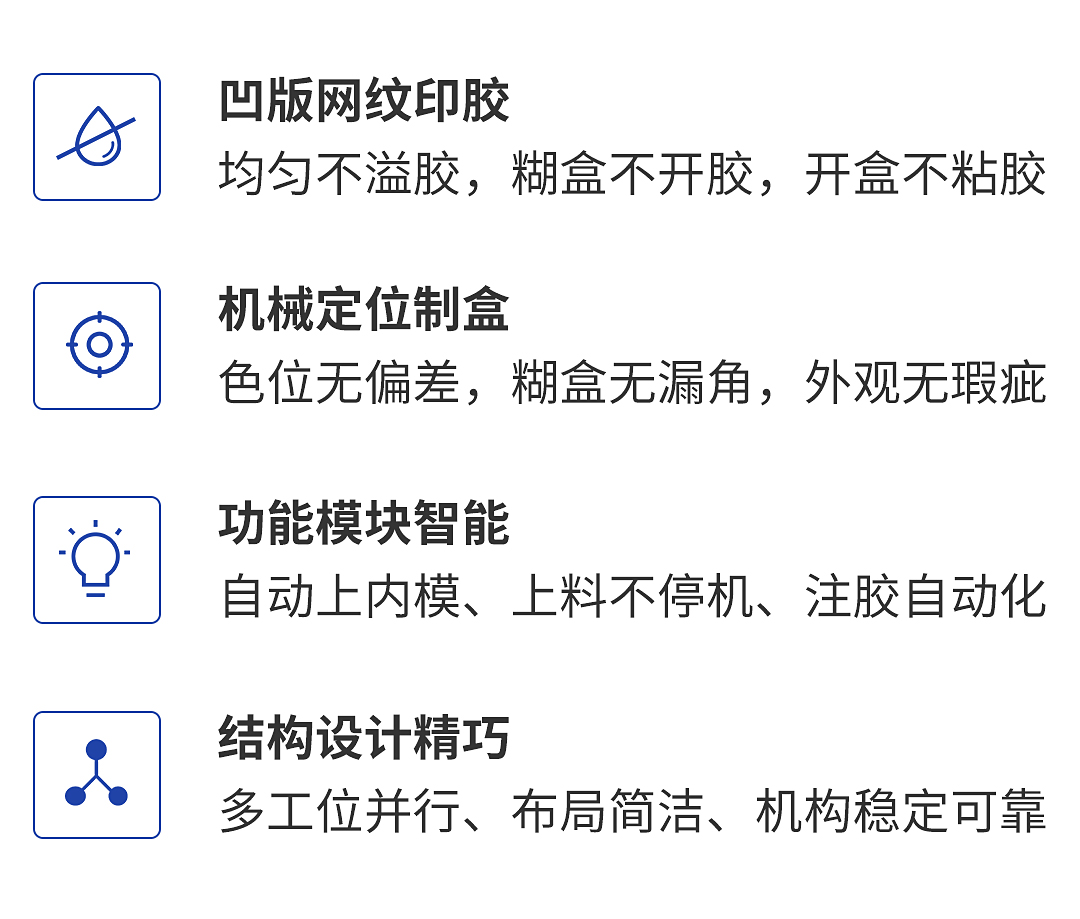 高度還原“手工制盒”工藝流程,采用多工位轉(zhuǎn)盤并行生產(chǎn),操作維護簡單,運行穩(wěn)定效率高。采用分體式機組節(jié)省占地面積,模塊化換模,換模簡單靈活,盒型尺寸適應(yīng)范圍廣。