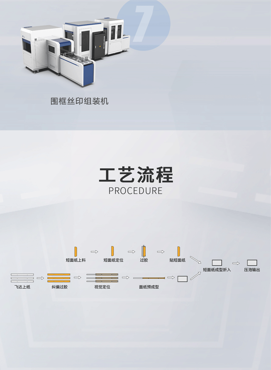 該整線可實現(xiàn)長面紙過膠、灰板定位、圍框成型、短面紙滾膠定位,折入、刮楞/熱壓楞和壓泡等工藝。