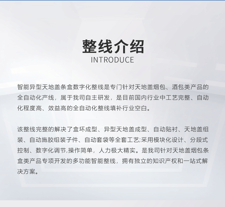 中科天工智能異型天地蓋條盒數(shù)字化整線是專門針對天地蓋煙包、酒包類產(chǎn)品的全自動化產(chǎn)線,屬于我司自主研發(fā),是目前國內(nèi)行業(yè)中工藝完整、自動化程度高、效益高的全自動化整線填補行業(yè)空白。