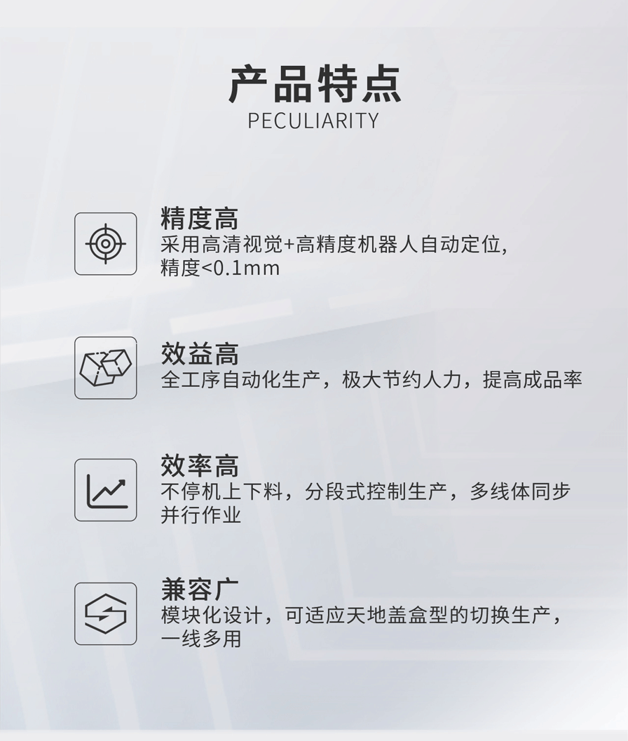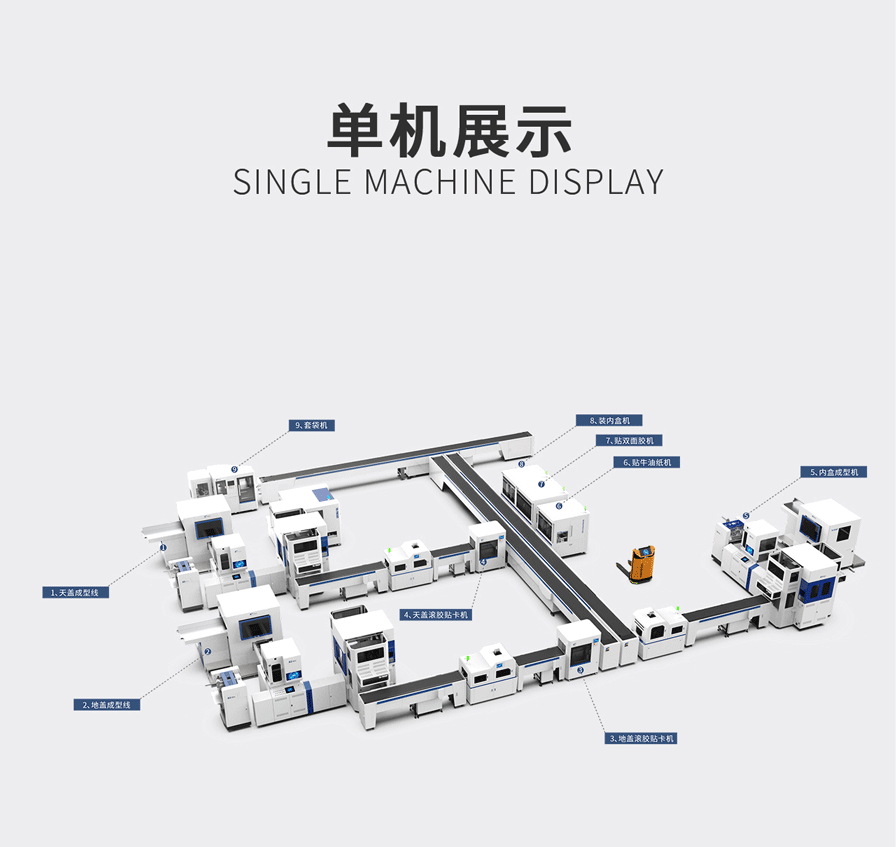 該整線完整的解決了盒坯成型、異型天地蓋成型、自動貼襯、天地蓋組裝、自動施膠組裝子件、自動套袋等全套工藝;采用模塊化設(shè)計、分段式控制、數(shù)字化調(diào)節(jié),操作簡單,人力極大精實。是我司針對天地蓋