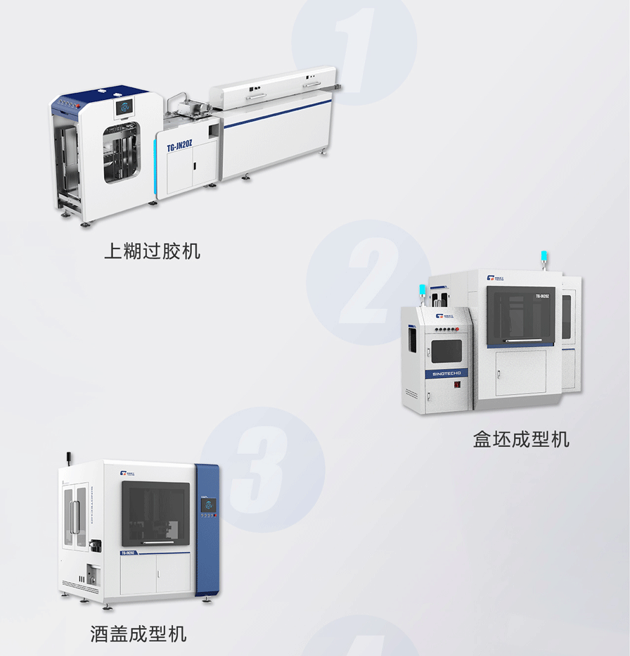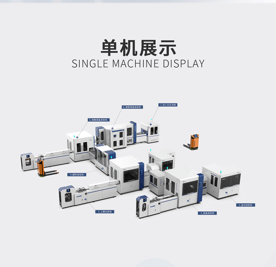 該整線完整的解決了盒坯成型、自動過膠定位、自動包面成型、自動組裝成型、自動貼襯、自動貼連接 紙、自動壓泡等全套工藝;采用模塊化設計,總線式控制,數字化調節(jié),操作簡單,人力極大精實。是我 司針對異型酒盒類產品專項開發(fā)的復合功能智能整線,擁有獨立的知識產權和一站式解決方案。